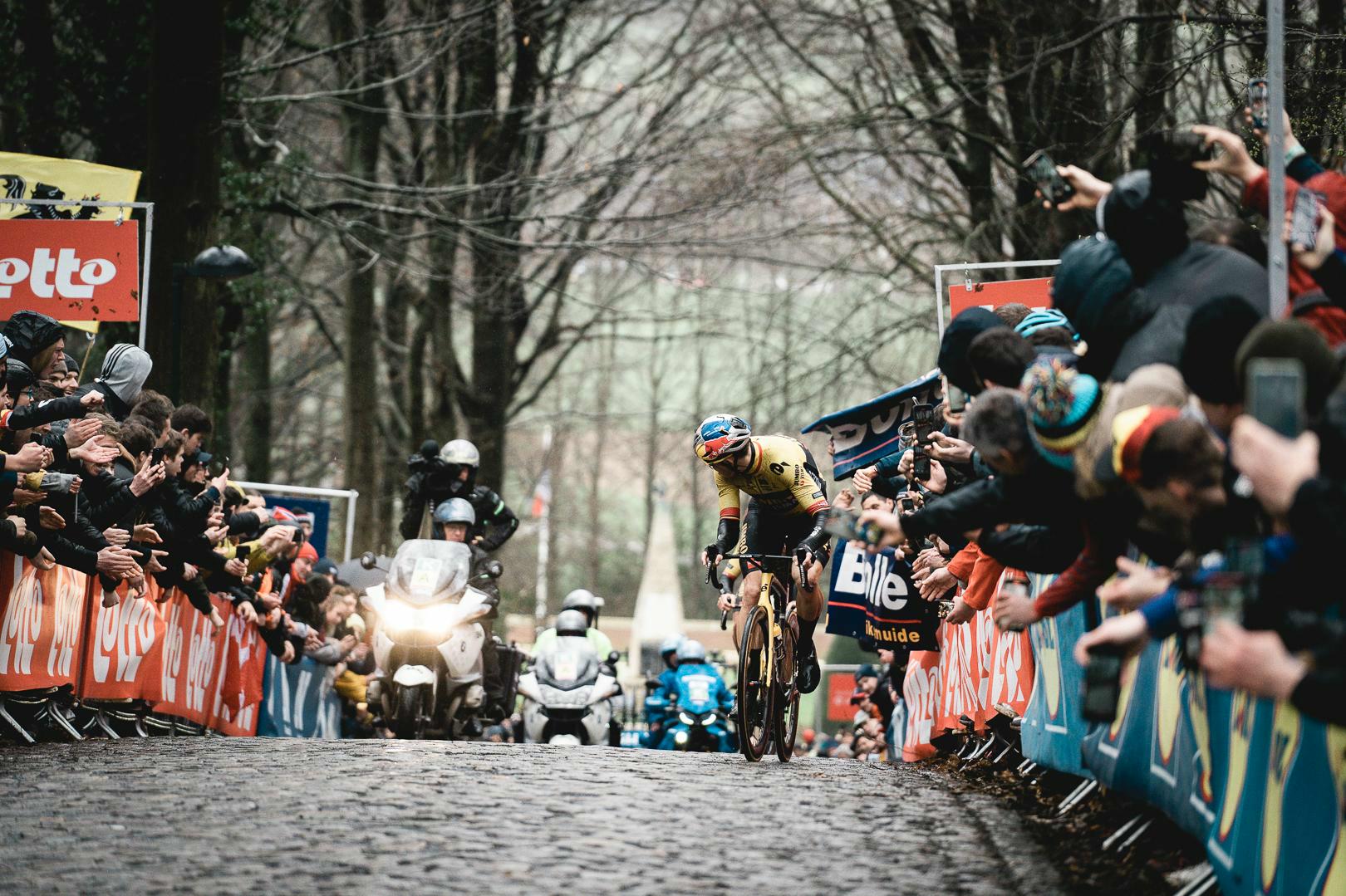 On the second climb of the Kemmelberg it was favourite Van Aert (Jumbo-Visma) who unleashed his devils. He accelerated and was only joined by teammate Laporte. The two started a clutch time trial towards Wevelgem. On the third and final climb of the Kemmelberg, Van Aert went to test his legs. Teammate Laporte had to let go, but was able to rejoin Van Aert at the top.