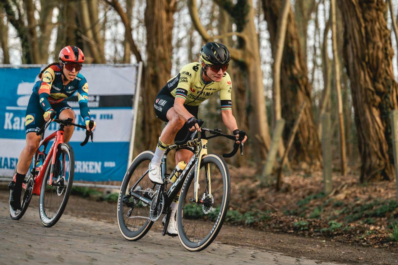 At the top of Ladeuze, Van Empel (Team Visma I Lease A Bike) pulled firmly ahead, with only Pieterse, Van Anrooij & Longo Borghini (Lidl-Trek), Paternoster (Team Jayco-AlUla) and Vos (Team Visma | Lease a Bike) able to follow her trail. On the Huisepontweg, it was the world champion who crossed from the peloton and joined the elite leading group.